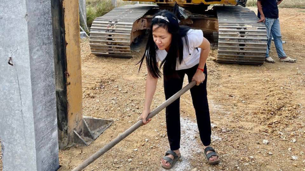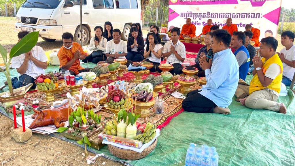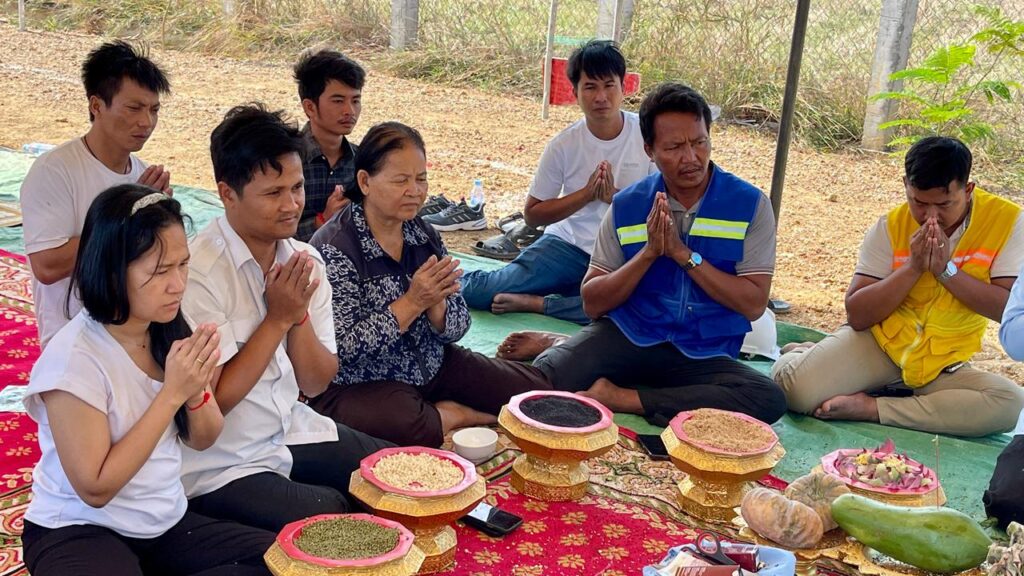 Nun fand auch die Einsegnung des Grundstücks und dem symbolischen Spatenstich durch Kakada und Channthou statt. Zu diesem Fest waren auch die örtlichen Mönche, das Lehrerkollegium, die Bauarbeiter und Gemeindemitglieder eingeladen. Es wurde für die Sicherheit der Bauarbeiter und den Erfolg aller Schüler, die diese Schule besuchen werden, gebetet.